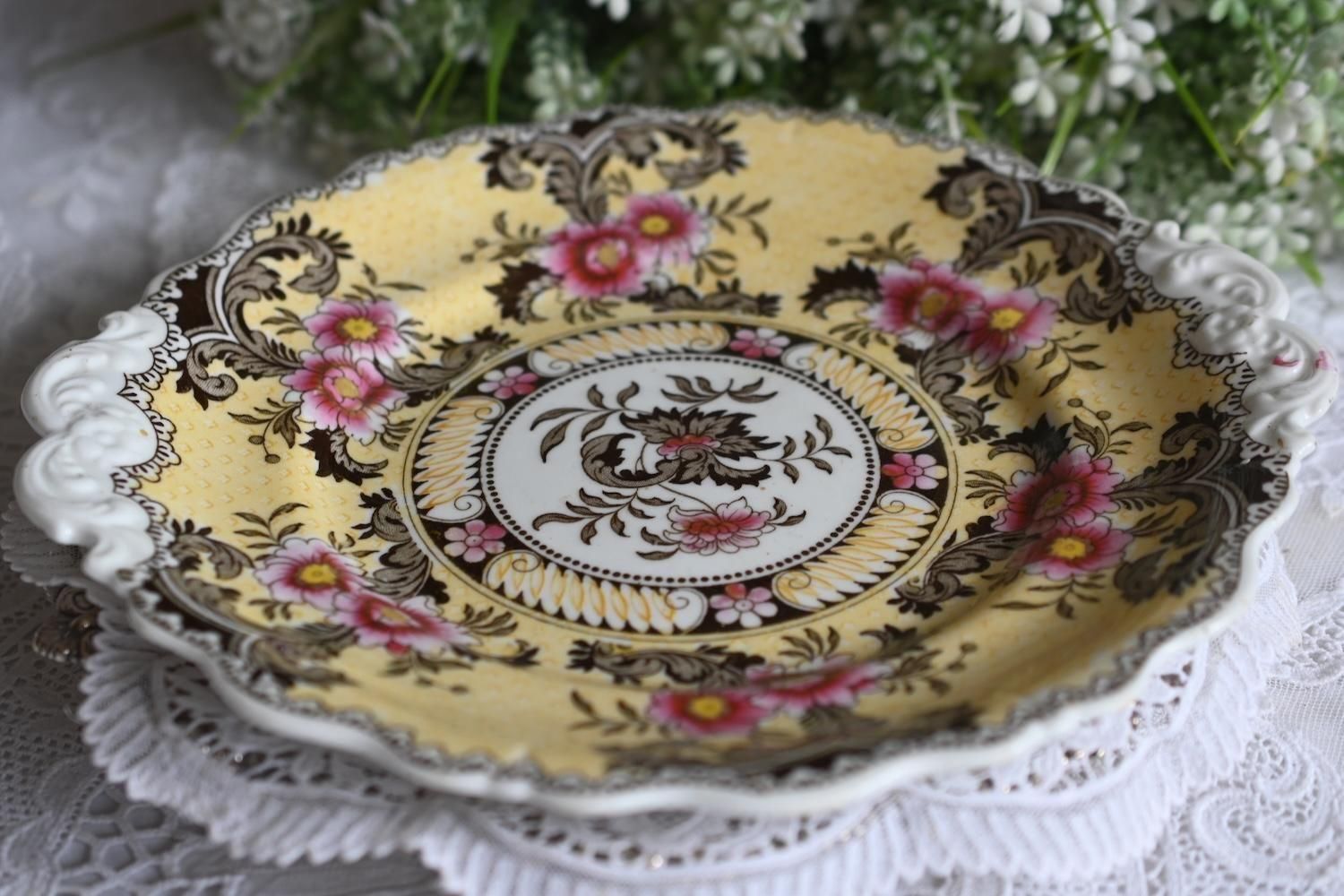 ヴィクトリア時代初期 リッジウェイ 珍しいトランスファーのイエロー模様の中皿 (送料込)