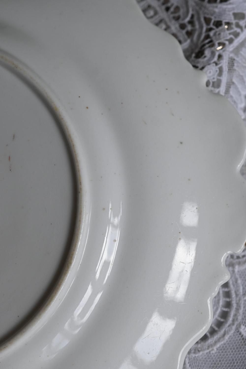 1830年〜1840年代に作られた、リッジウェイの中皿です。細かなシノワズリを思わせるトランスファーの絵柄が珍しいお品です。ひらひらした縁取り、白いハンドルが華やかさをさらに加えています。