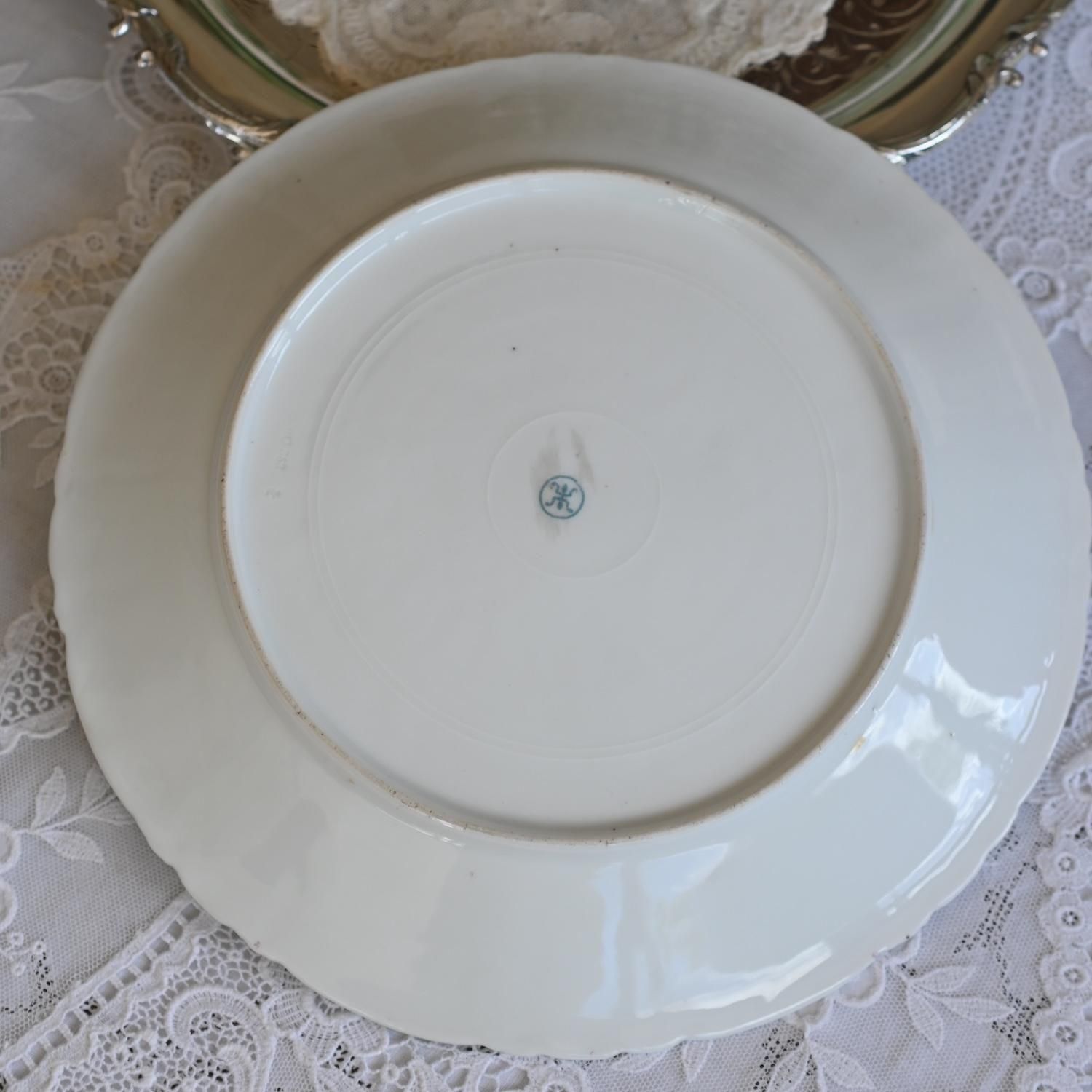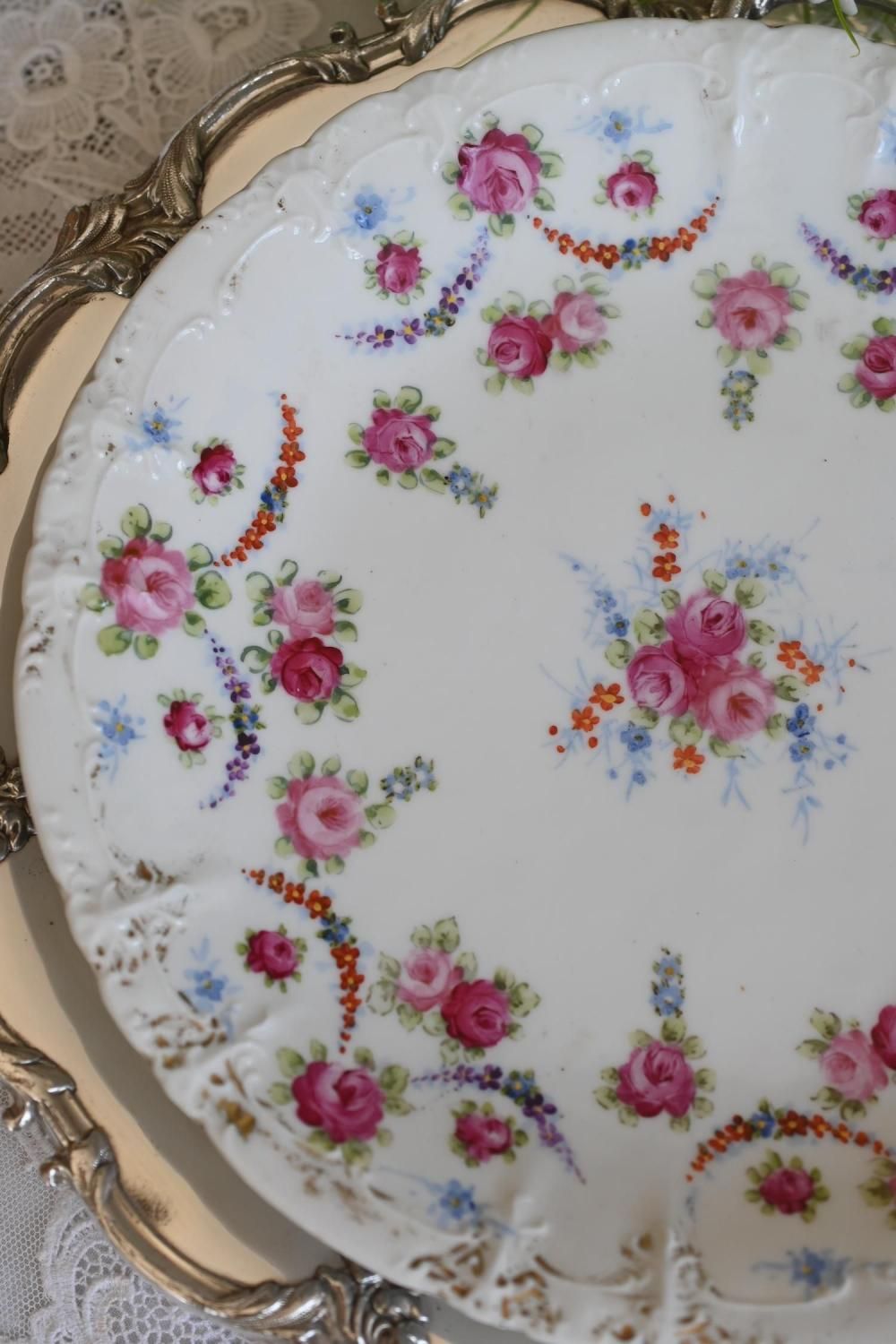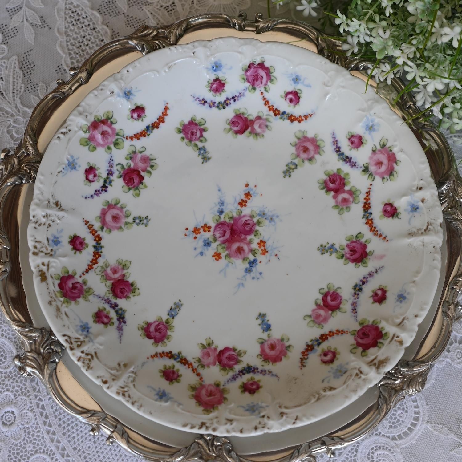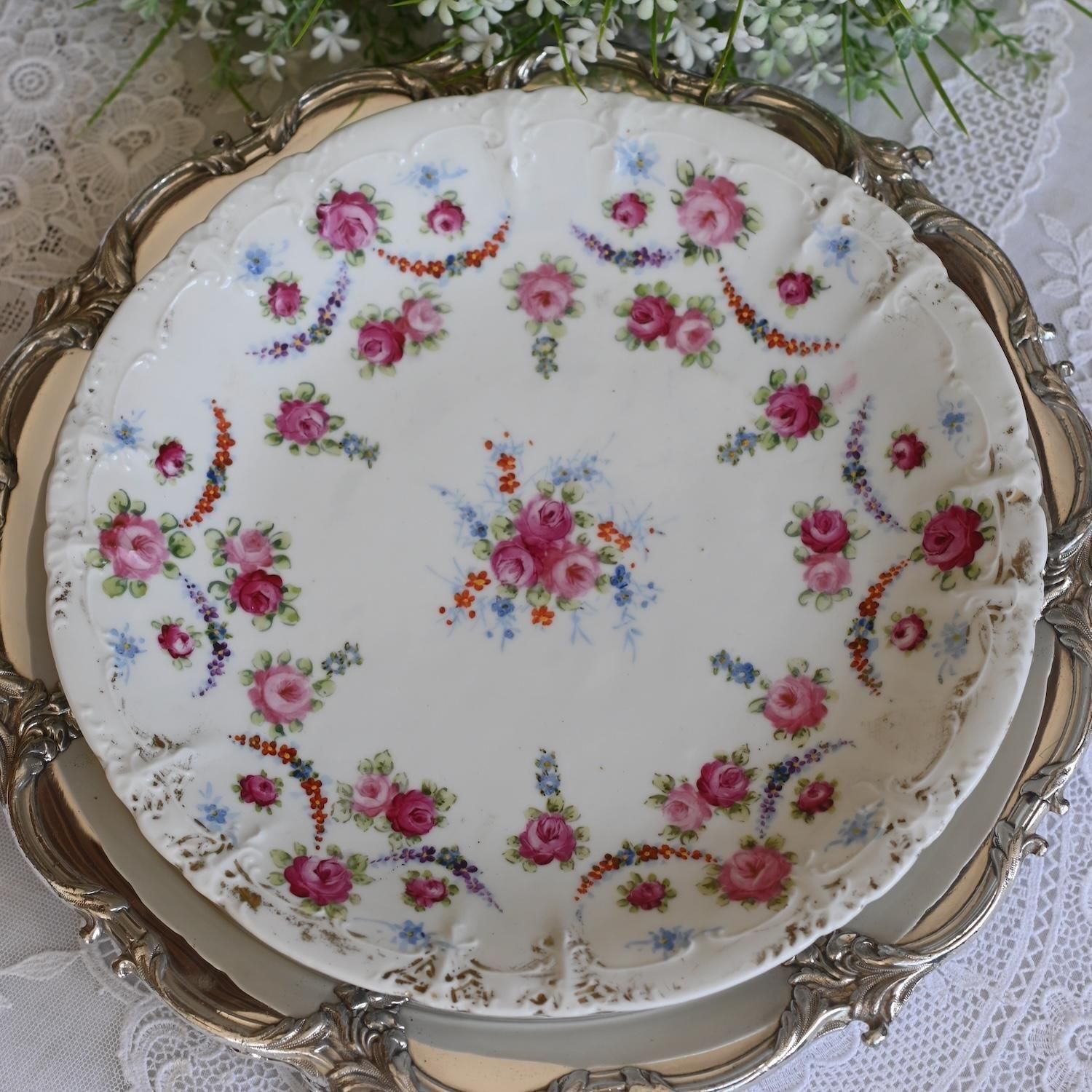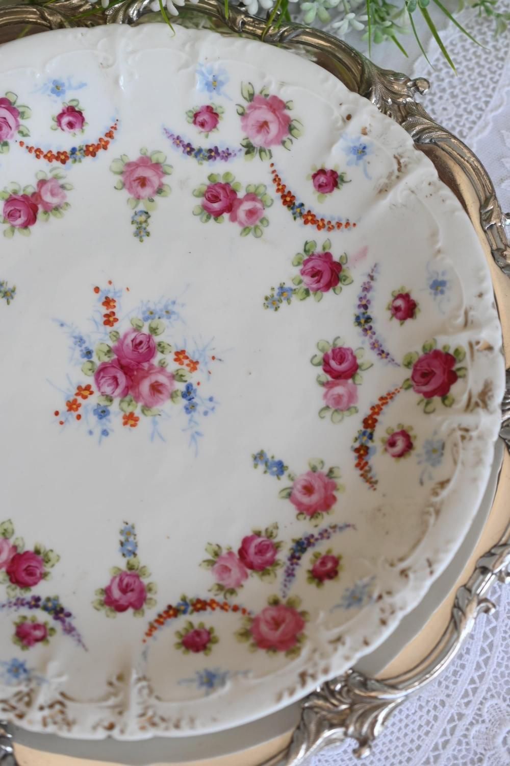恐らくプレートの縁とガーランドのつなぎ目部分、1輪のバラとバラの間に金彩模様が入っていたと思われますが、殆どが取れてしまっており、うっすらと金が残っている状態です。元々はゴージャスなプレートであったろうと推察されますが、たとえ金彩がなくとも華やかで美しいプレートです。