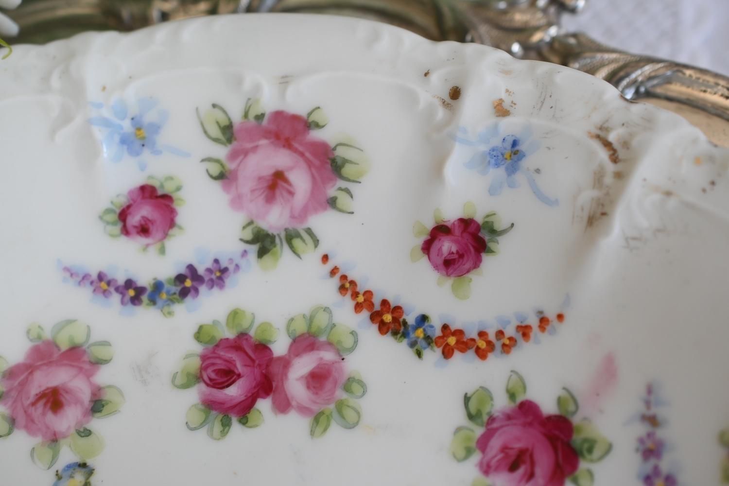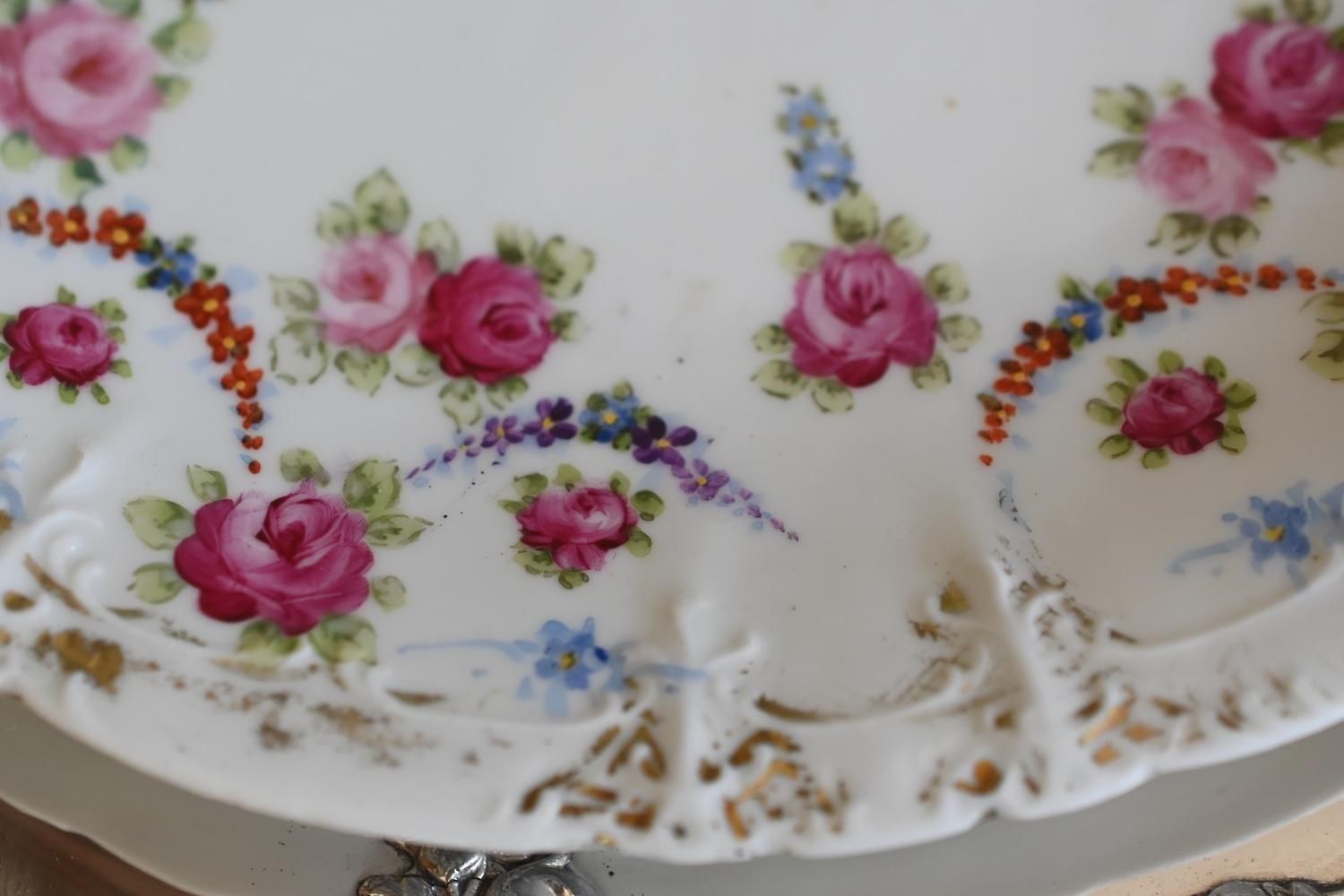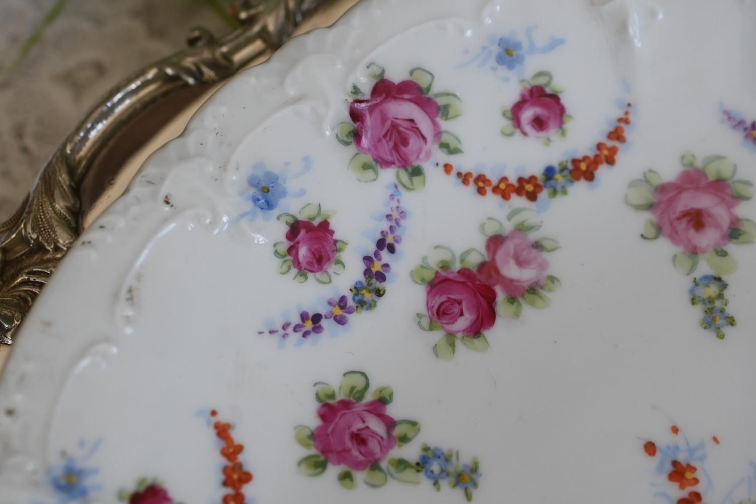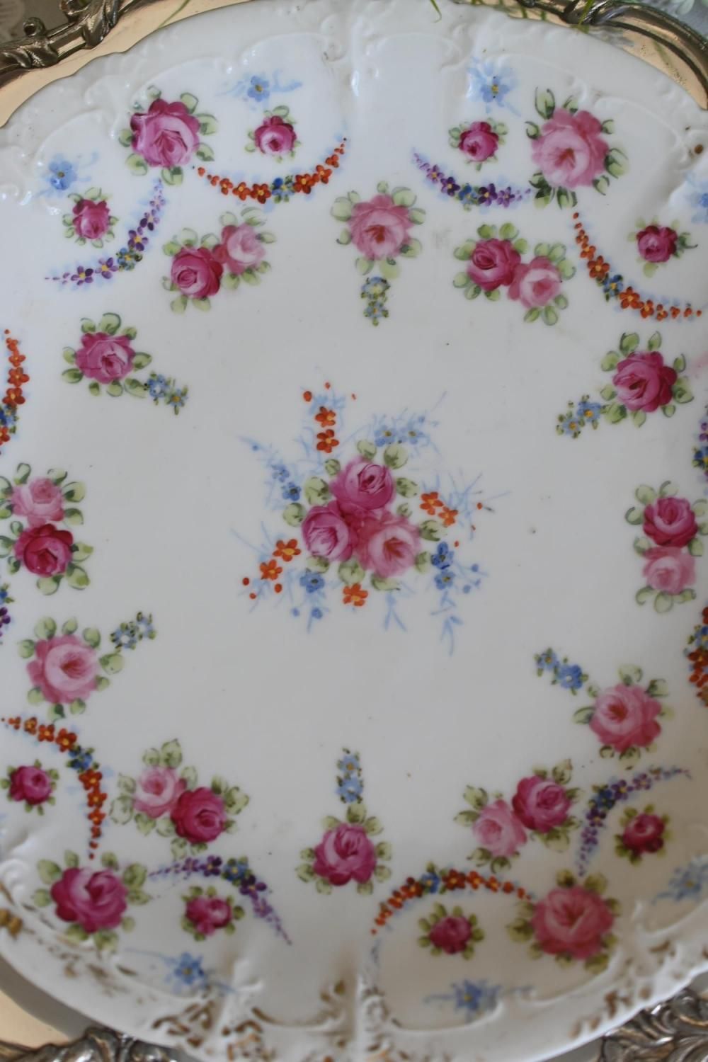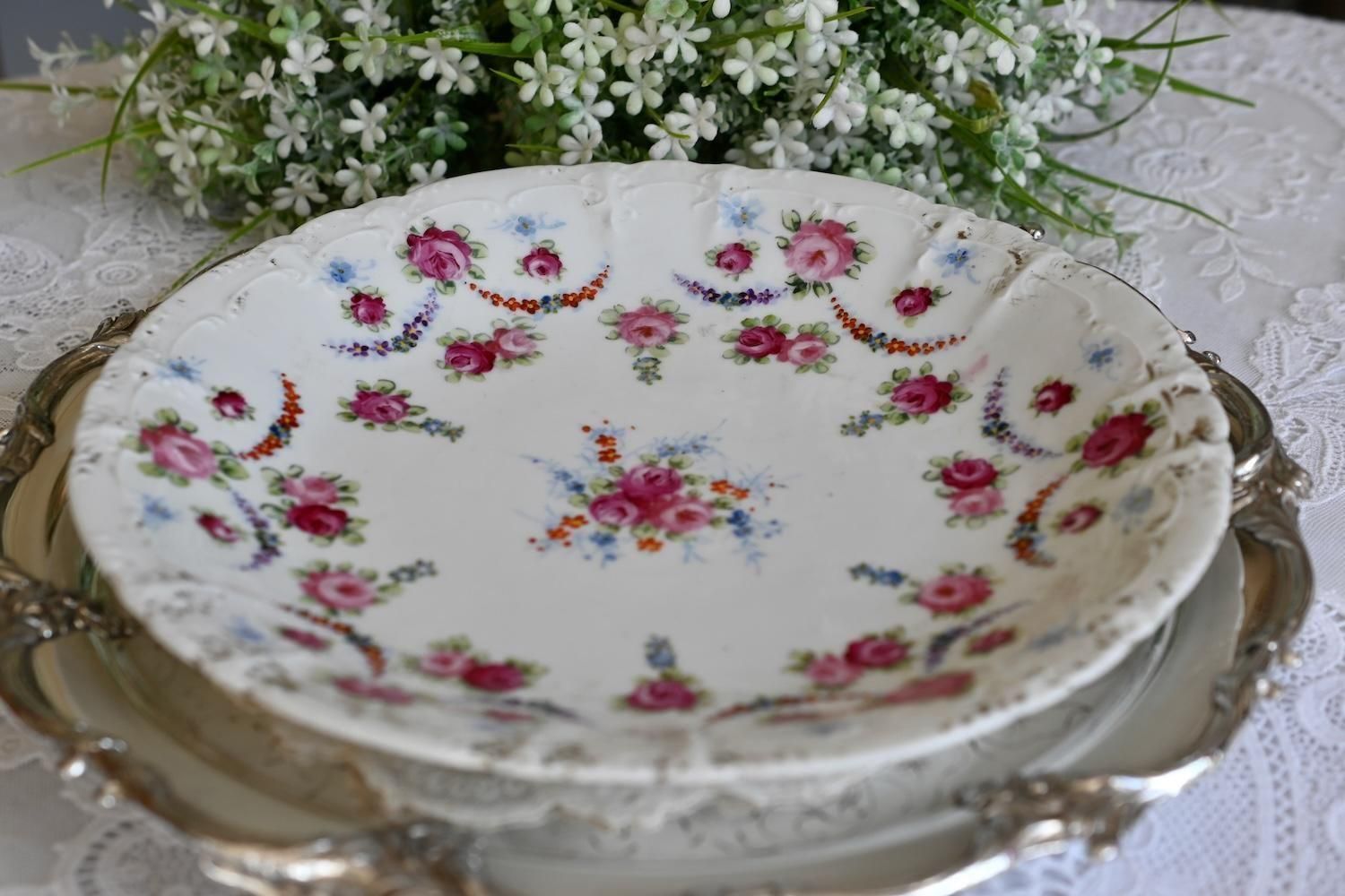 恐らくプレートの縁とガーランドのつなぎ目部分、1輪のバラとバラの間に金彩模様が入っていたと思われますが、殆どが取れてしまっており、うっすらと金が残っている状態です。元々はゴージャスなプレートであったろうと推察されますが、たとえ金彩がなくとも華やかで美しいプレートです。
